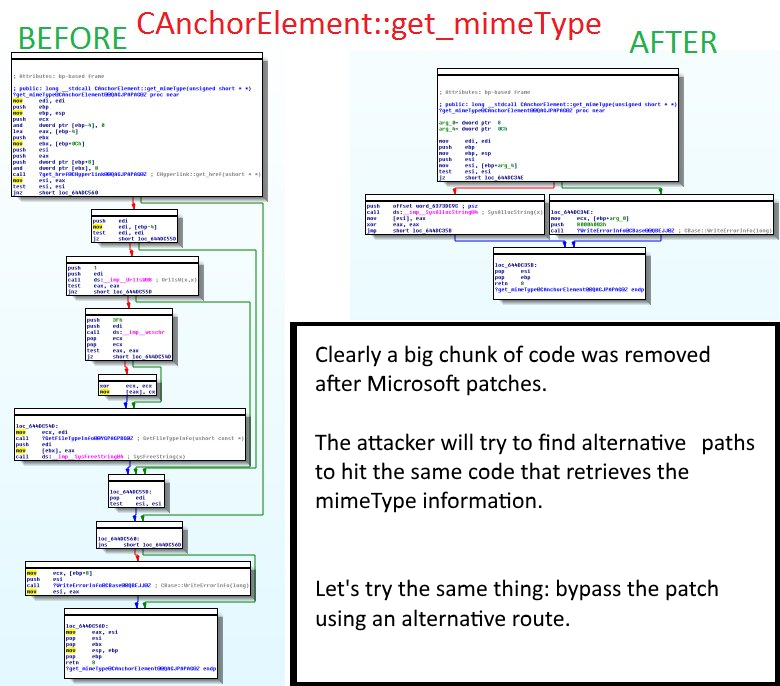 So the patch is brutal but ideas start flowing. Why don’t we find an alternative route (aka variation) like real attackers do? It might be possible and worth a few minutes. So we need to get the unpatched code (from mshtml.dll in this case) and find what’s the binary function that gets hit when we access the anchor mimeType. Then, we need to find a way to call that same code using a different path.