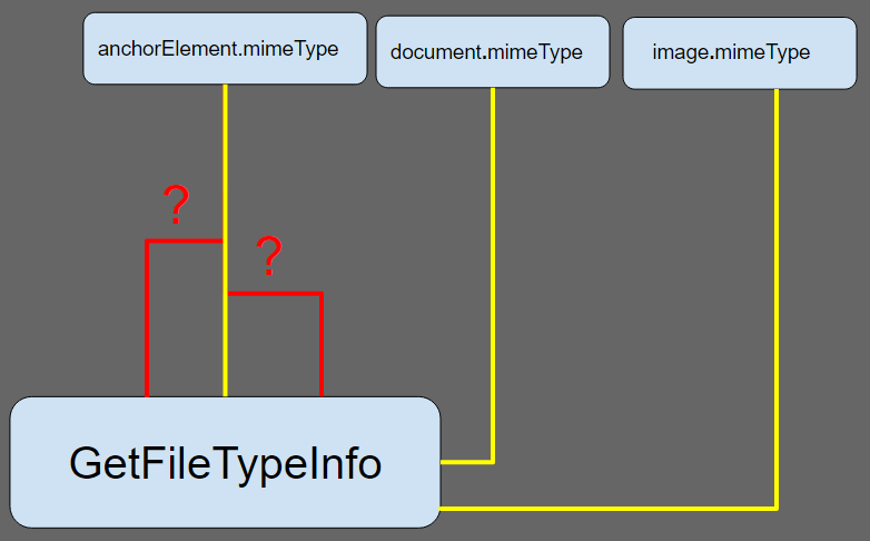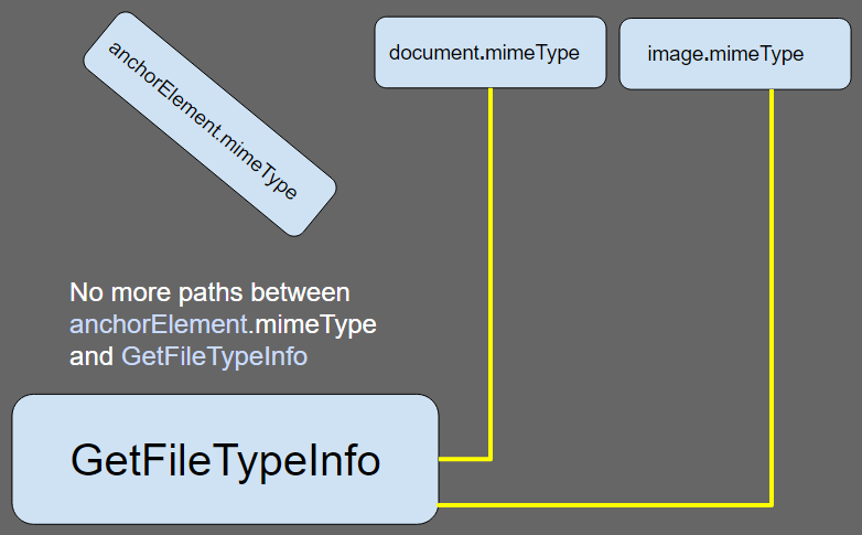 We still don’t know if the anchorElement has other paths to the same code, but why bother? We are working with the unpatched binary and as we’ve seen at the beginning, the patched one has been seriously trimmed. In fact, a quick analysis reveals that anchorElement.mimeType and GetFileTypeInfo are not connected anymore. By “quick analysis” I mean pressing the “X” over the GetFileTypeInfo function inside IDA on the patched file. So, the updated flow really looks like this: