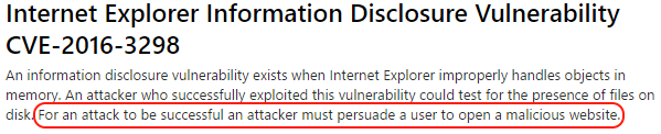 Proofpoint discovered at least two information disclosure bugs (CVE-2016-3351, CVE-2016-3298) exploited on the wild which were reported to Microsoft between October and December of 2015. Microsoft patched CVE-2016-3351 (mimeType disclosure) in September 2016 and CVE-2016-3298 (file existence check) in October 2016. Unfortunately both patches were bypassed in less than a day.