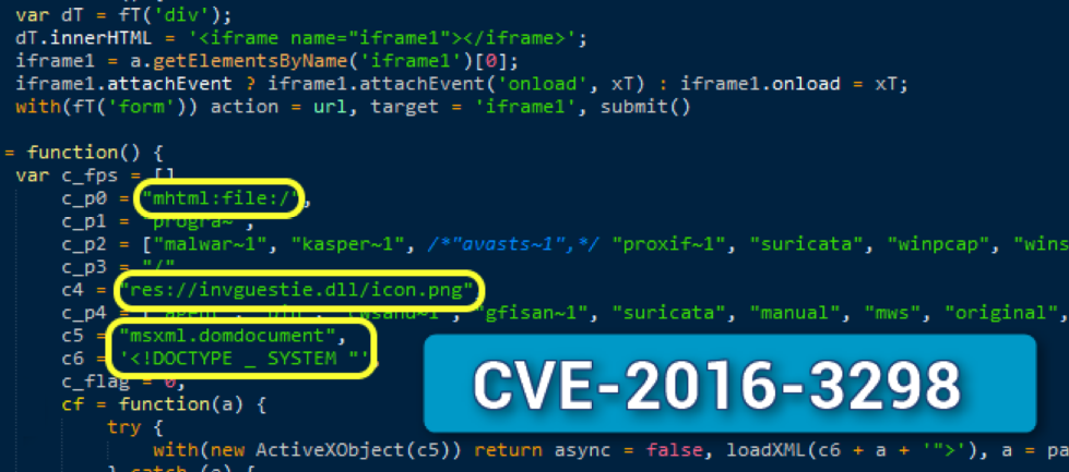 It seems attackers will continue fingerprinting us regardless of the patch. The variation was easy but taking a closer look we can see that onreadystatechange was replaced by onload, because the former didn’t fire. On the other hand, IE failed to render the resource the first time that loaded it, so we are now setting the iFrame location twice using the exact same mhtml:res URL.