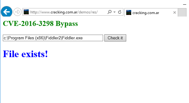 Today we are going to work with another fingerprinting bug which allows attackers to check the presence of files in our PCs. According to the fellows at Proofpoint, Microsoft finally patched this information disclosure bug which was being used in different malvertising campaigns and exploit kits. If you have no idea about this, let me recap in two lines:
