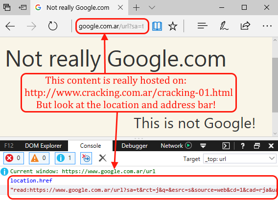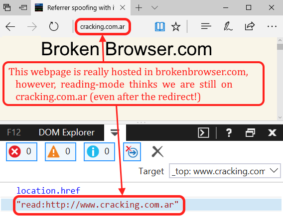 That worked perfectly well, but something called my attention: the URL in the address bar is cracking.com.ar but the rendered content comes from brokenbrowser.com. What? Well, if we go to cracking.com.ar we will see there’s a location.replace to brokenbrowser.com, but Edge did not update the address bar!