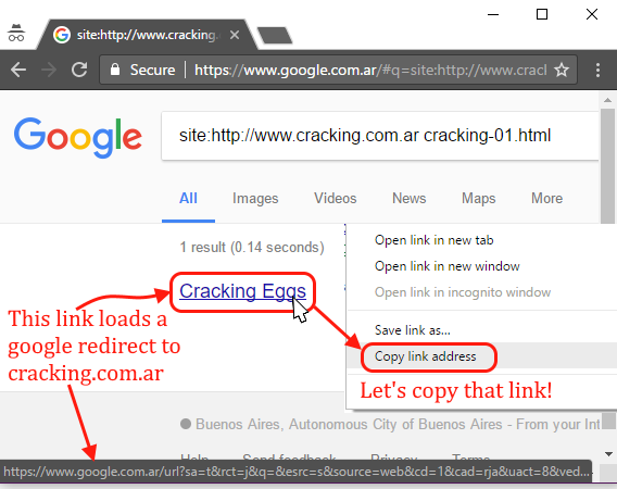 By the way, it is not hard to spoof google considering that all its organic results are links that redirect to the target sites. For example, google has indexed a page “cracking-01.html” from cracking.com.ar, if we find the organic link that redirects to that page then we have the control. Makes sense? Let me open Chrome for a second and find a google redirect to cracking.com.ar. Remember: our goal is to find a google URL that redirects to a website that we control.