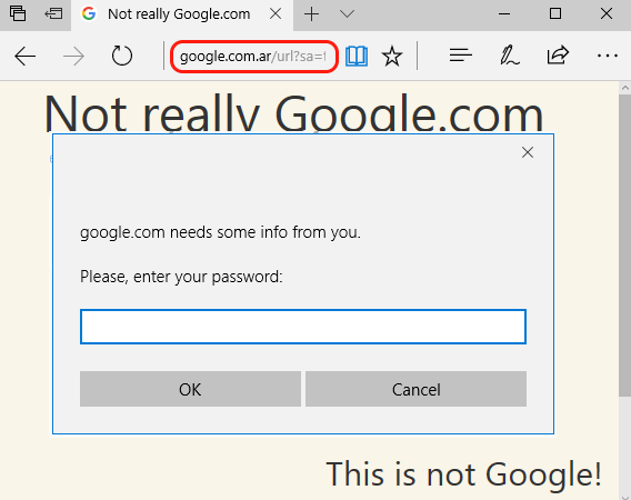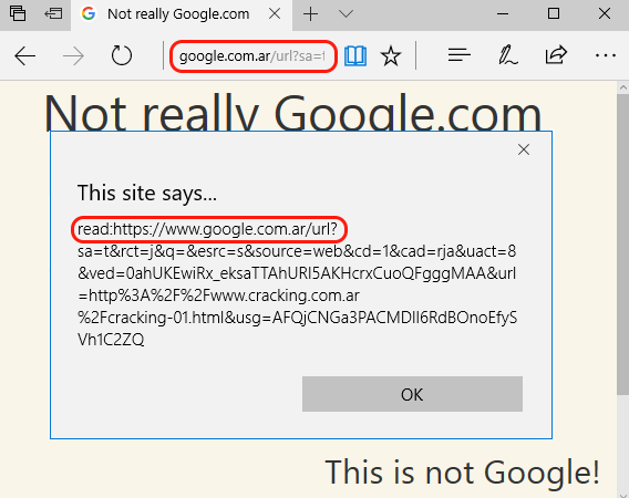 Now we have a google.com.ar URL that redirects to cracking.com.ar. The webpage in cracking.com.ar has a text saying “Not really Google” so we can easily identify where the content is really coming from. Below is the google redirect with the prepended read: protocol, opening that in Edge looks like this: