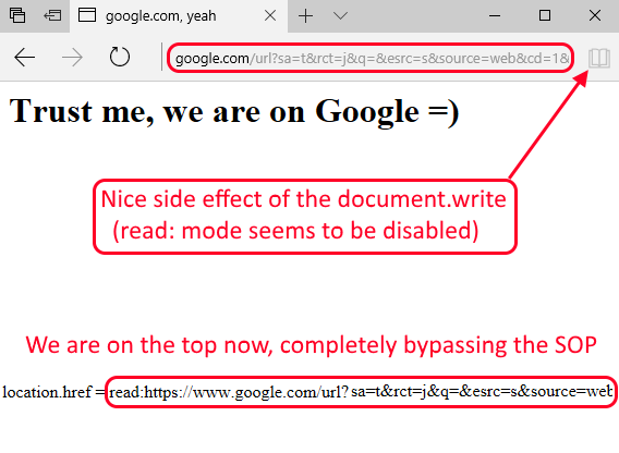 Oppss! Not so fast. Edge does not allow us to access any other document from this data uri, and that’s correct! All browsers render data uris as unique origins different from their creators, but on Edge this restriction is easy to bypass: a self-document.write *after the page has been loaded *is enough to set our location matching our parent.