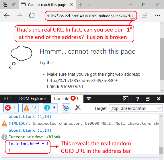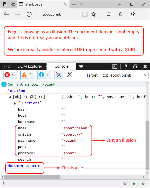 Let’s experiment! Open Edge with DevTools enabled (F12) and type about:blank into the address bar. This used to create a domainless blank and it still looks as if nothing has changed, but Edge is performing a trick for us. Appreciate its magic for a second please, we will have plenty of time to break the spell anyway.