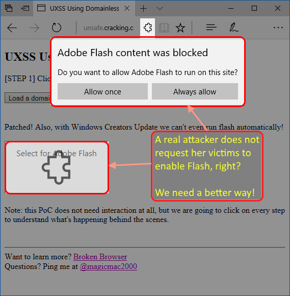 Our previous technique to create domainless blanks has been patched. We were setting a data-uri on the main (top) window with the help of a Flash/GetURL. But the trick was patched and even worse, we can’t automatically run Flash anymore! In Windows Creators Update, Edge asks for permission to run Flash.