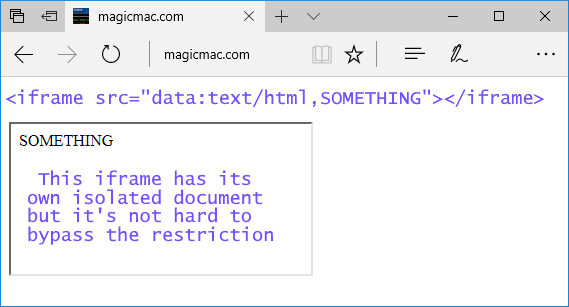 Our data-uri trick against the top does not work anymore, so how can we overcome this? First of all, I started playing against an iframe instead of the top, because as we’ve seen in the past, Edge does not like data-uris in the main window.
