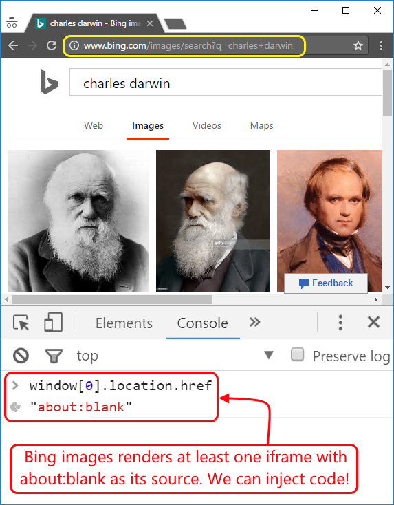 We will create a webpage with two iframes: one with bing.com and one domainless. From the domainless we will execute code inside bing’s inner blank iframe. Bing images is perfect for our needs. Let me open Chrome for a second and show you what I mean.