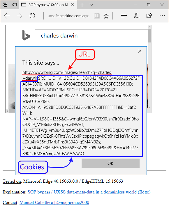 - Set its location again to about:blank, but this time using a meta refresh which makes its domain == its creator: bing.com in this case.