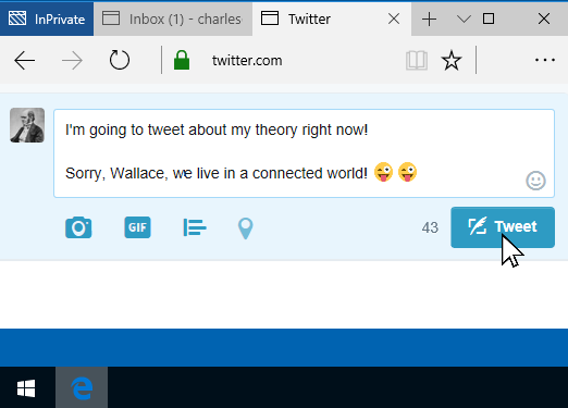 He is in good mood, to the point that he opens another tab with his Twitter account, and teases Alfred Wallace about who will tweet first.