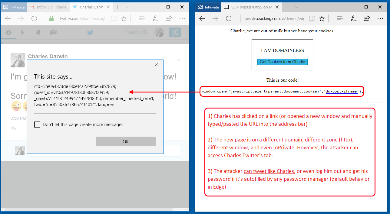 Watch the 2 minutes exploit video where we manually tweet as if we were Charles Darwin, and get his password (thanks to the default password manager of Microsoft Edge). If you are out of time, watch the 1 minute video where we do the same thing, automatically.