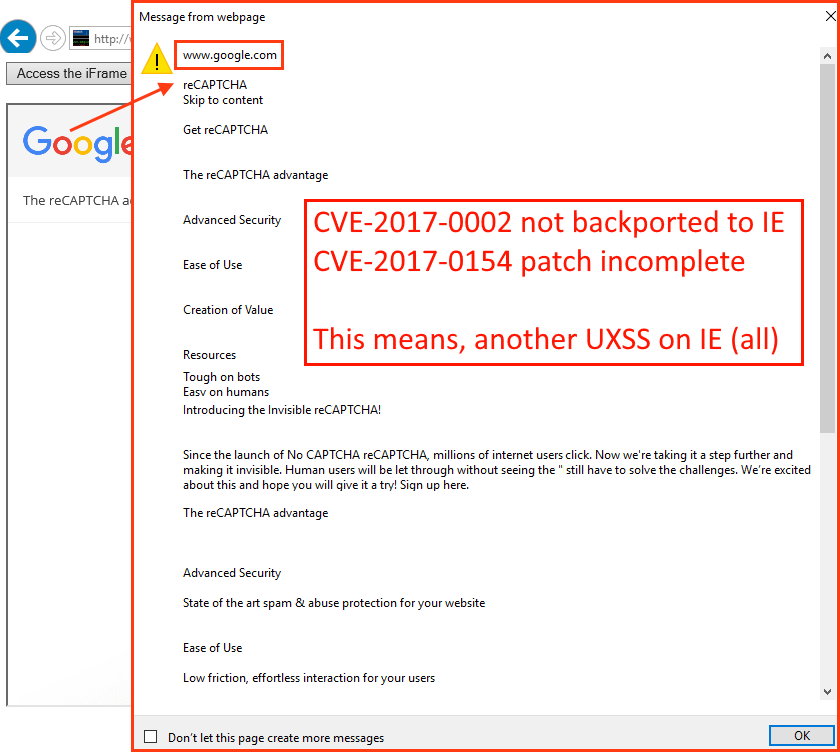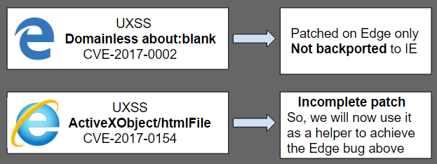 A few months ago we’ve been playing with domainless about:blank pages on Edge. Essentially, a powerful about:blank document was capable of accessing every domain without restrictions. It was recently patched as CVE-2017-0002 so it does not work anymore. The same thing happens with the ActiveXObject/htmlFile (from now on, htmlFile) which was patched last week as CVE-2017-0154.
